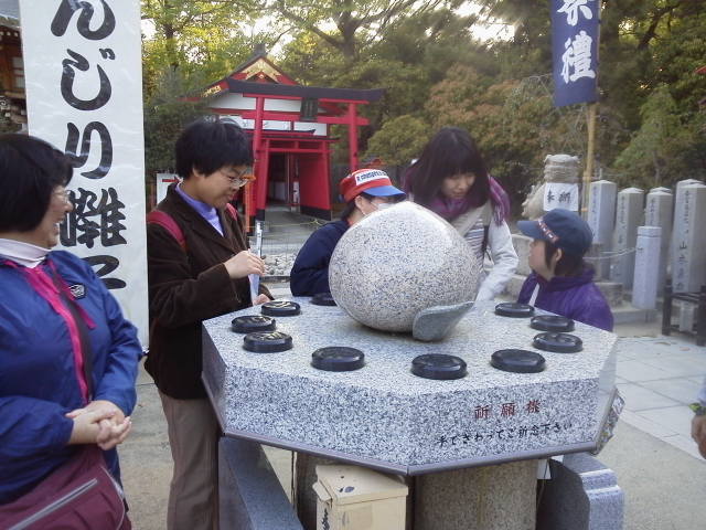 その後、干支の部分に触れてお願い事をするとご利益があるという桃の形をした石を囲みつつ、